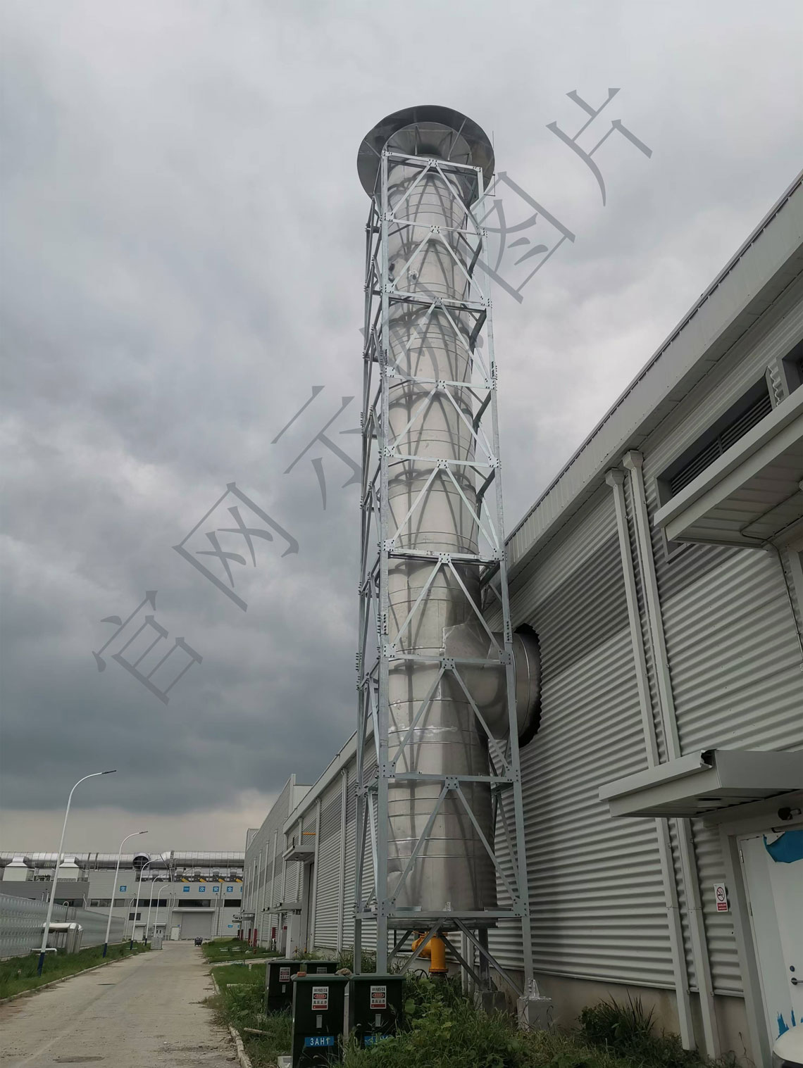 该项目为扬州锅炉房烟囱,户外采购塔架支撑烟囱排放烟气。